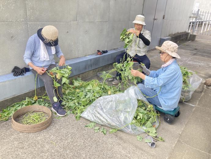 プランターではサツマイモを栽培中です。収穫前に茂り過ぎた葉を刈り取って、芋つるを切る作業をしました。