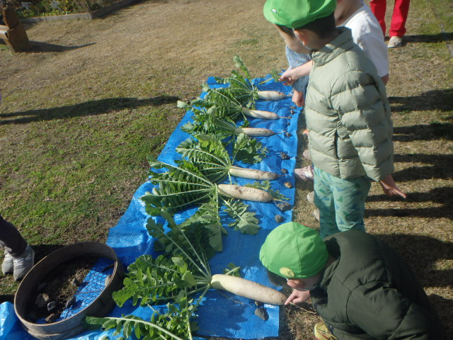 晴れた気持ちのよい午前中、それぞれのグループに分かれて、京緑隊の皆さんにお手伝いいただきながら、一人ひとりが大根を収穫しました。収穫した大根を並べて、形や大きさを友達と比べ合う姿が楽しそうでした。