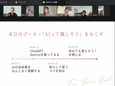 この講座は、子育てや家事、仕事の準備で追われる日々の中で「AIは難しそう」「自分には関係ない」と感じている忙しいママたちが、生成AIを日々の生活や社会貢献活動に無理なく組み込み、「自分らしい可能性」を広げることを目的に開催しました。