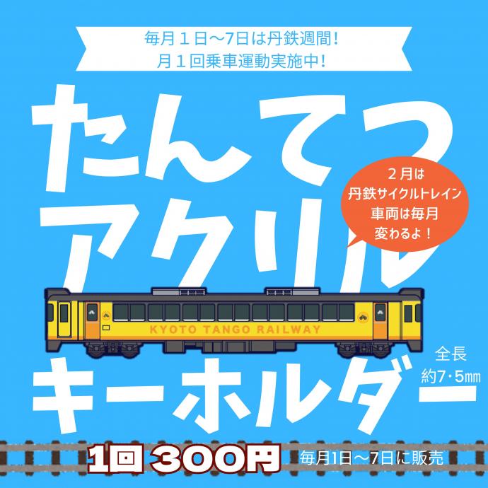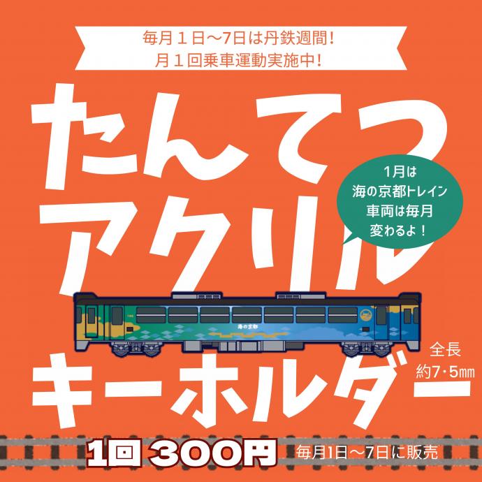 月1回乗車運動実施期間である毎月1日~7日に、毎月異なる丹鉄車両をデザインした、アクリルキーホルダーを期間限定で販売いたします!