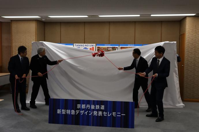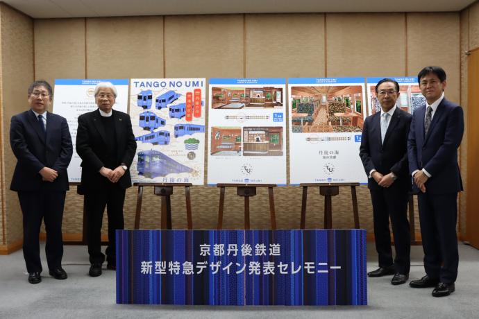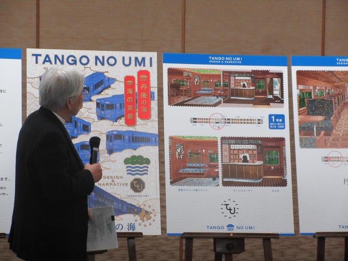 デザイン・設計は、「丹後くろまつ号」など丹鉄の観光車両をはじめ、「ななつ星」などの多くの鉄道車両のデザインを手掛けてきた水戸岡鋭治氏(ドーンデザイン研究所)に依頼し、この度、車両のデザインコンセプトが決まったことを受け、デザインの発表(パース図の公表)セレモニーを1月29日に京都府庁で開催しました。