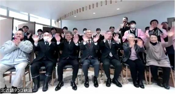 また、宮津駅にも、サテライト会場を設け、WEB中継を行ったところ、京都丹後鉄道利用促進協議会会長(城崎宮津市長)宮津線100周年記念事業実行委員会委員長(宮津商工会議所今井会頭)をはじめ、開業から丹鉄を応援いただいている方々が多数駆け付け、大変にぎわいました。