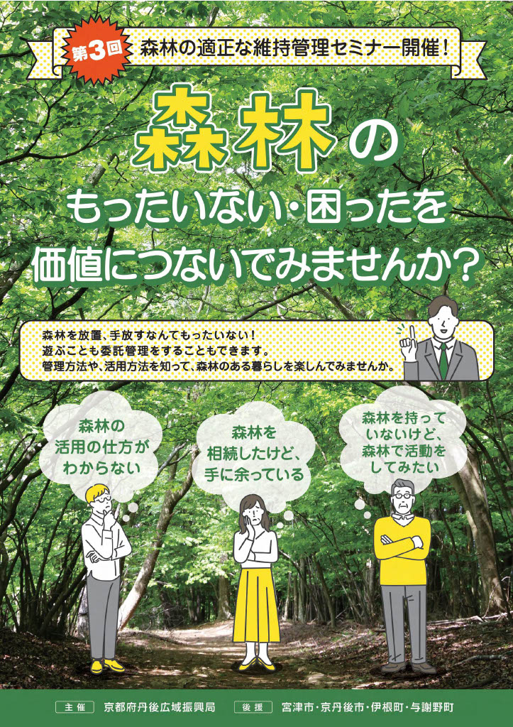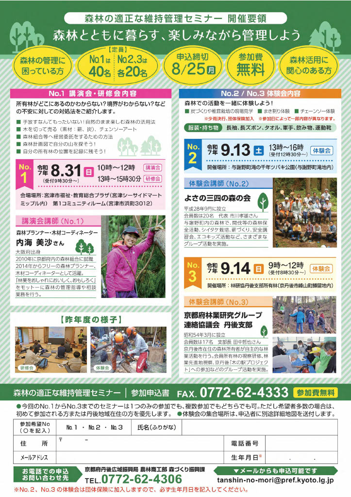 参加を希望される場合は、チラシ裏面の参加申込書を令和7年8月25日(月曜日)までに、丹後広域振興局森づくり振興課宛てにメール・FAXまたはお電話にて、お申し込みください。
