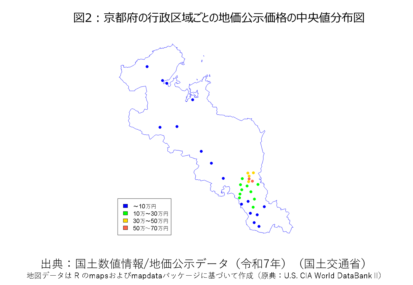 図2:京都府の行政区域ごとの地価公示価格の中央値分布図
