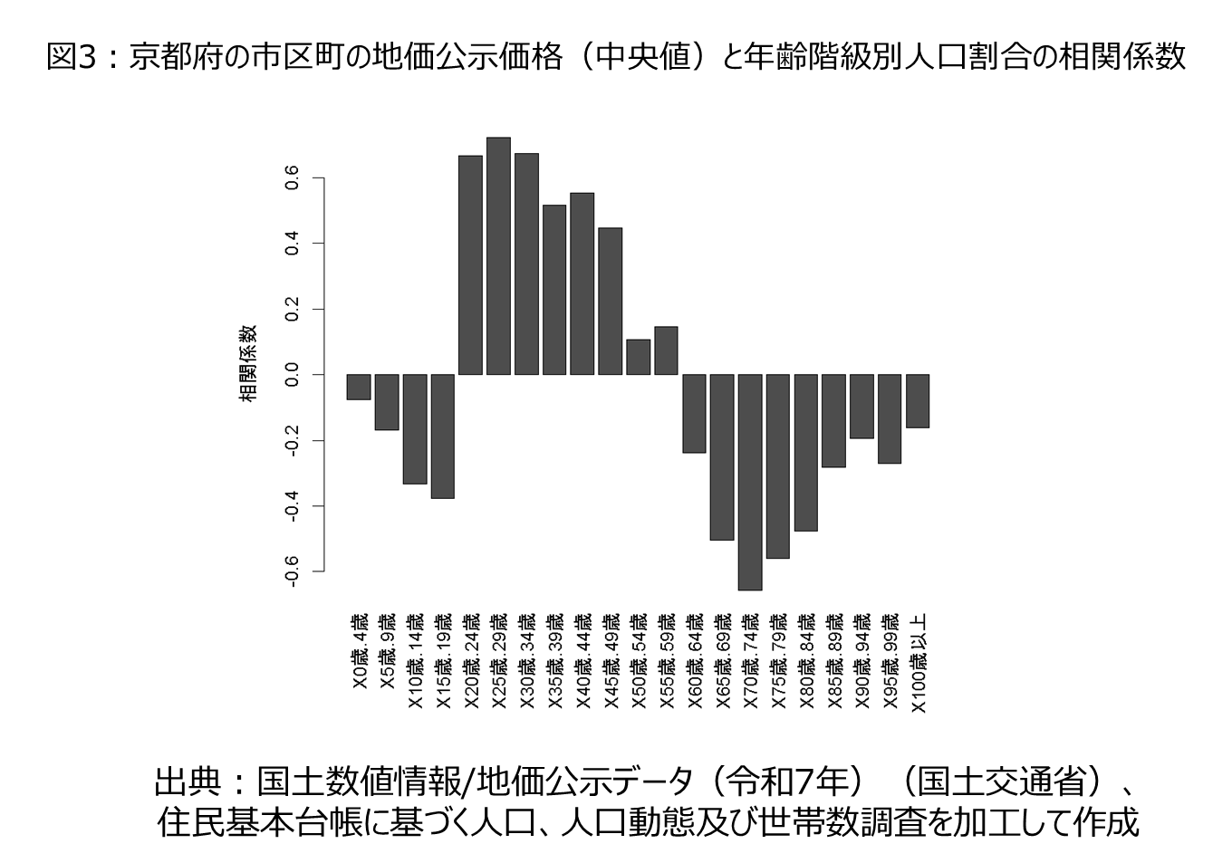 図3:京都府の市区町の地価公示価格(中央値)と年齢階級別人口割合の相関係数