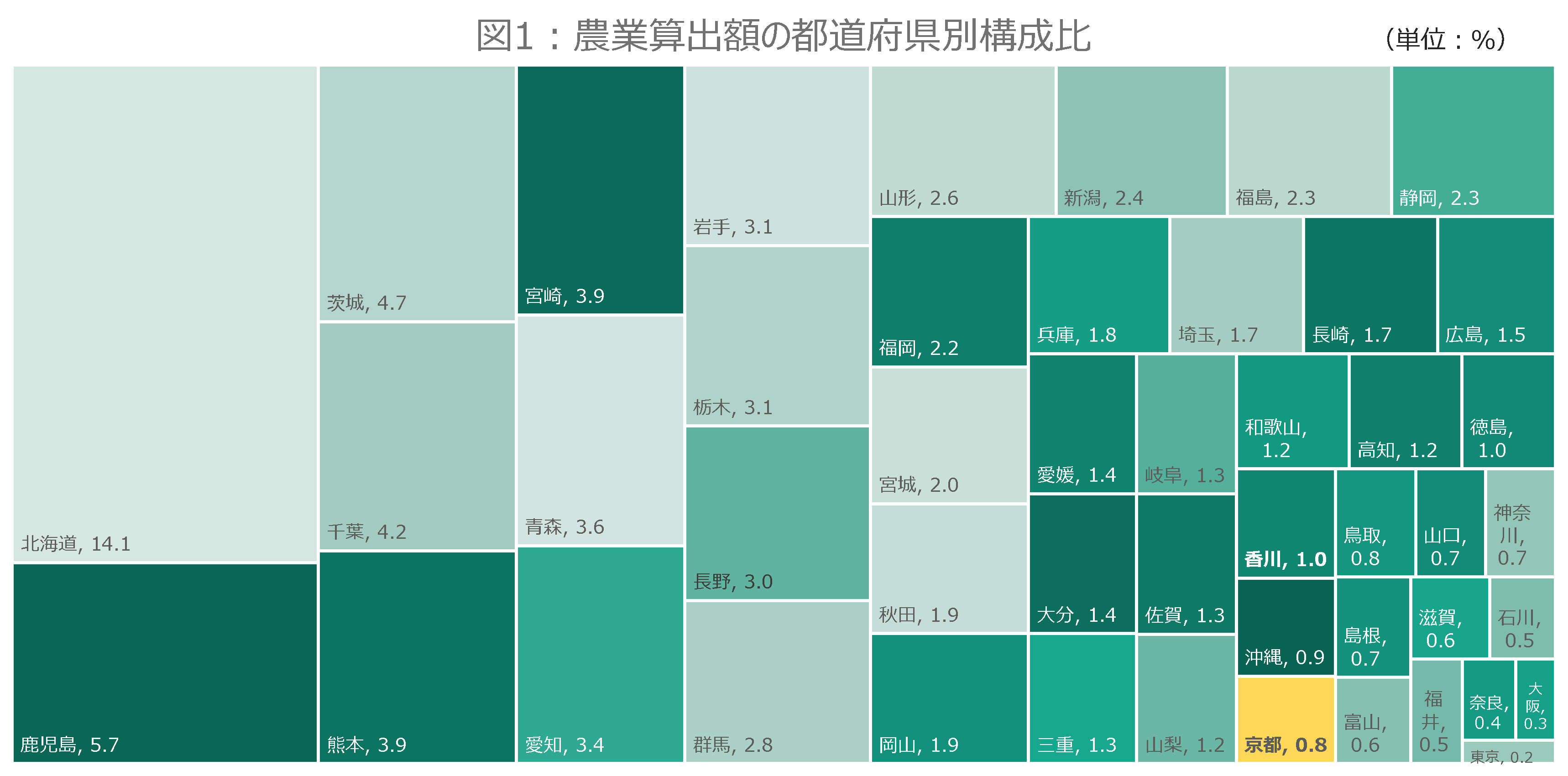 2023年の農業産出額を見ると、全国の産出額のうち、京都府の産出額は0.8%を占め、全国で37番目となっています。(図1)