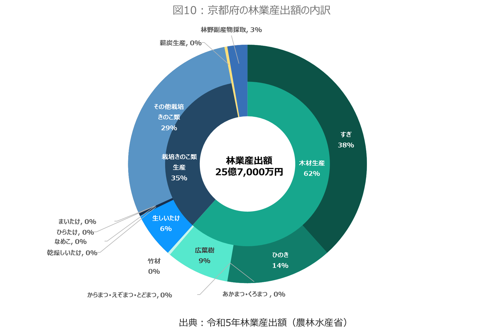 2023年の京都府の林業産出額は25億7,000万円で、その内訳は木材生産が約62%、栽培きのこ類生産が約35%、薪炭生産が約0%、林野副産物採取が約3%となっています。
