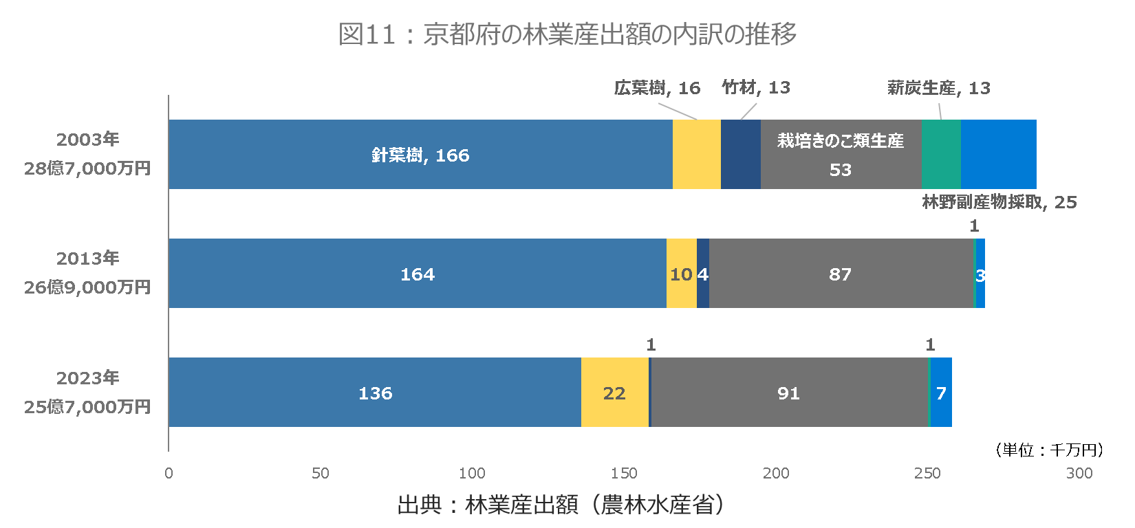 同じく林業産出額の結果から、京都府の林業産出額と内訳を見てみます。