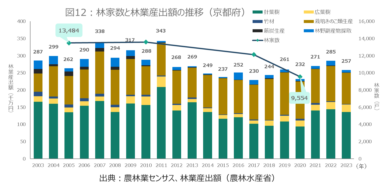 一方で、林業産出額は2003年が28億7,000万円で、増加と減少の波を繰り返し、2023年には25億7,000万円と、2003年比で約10%減少しています。(図12)