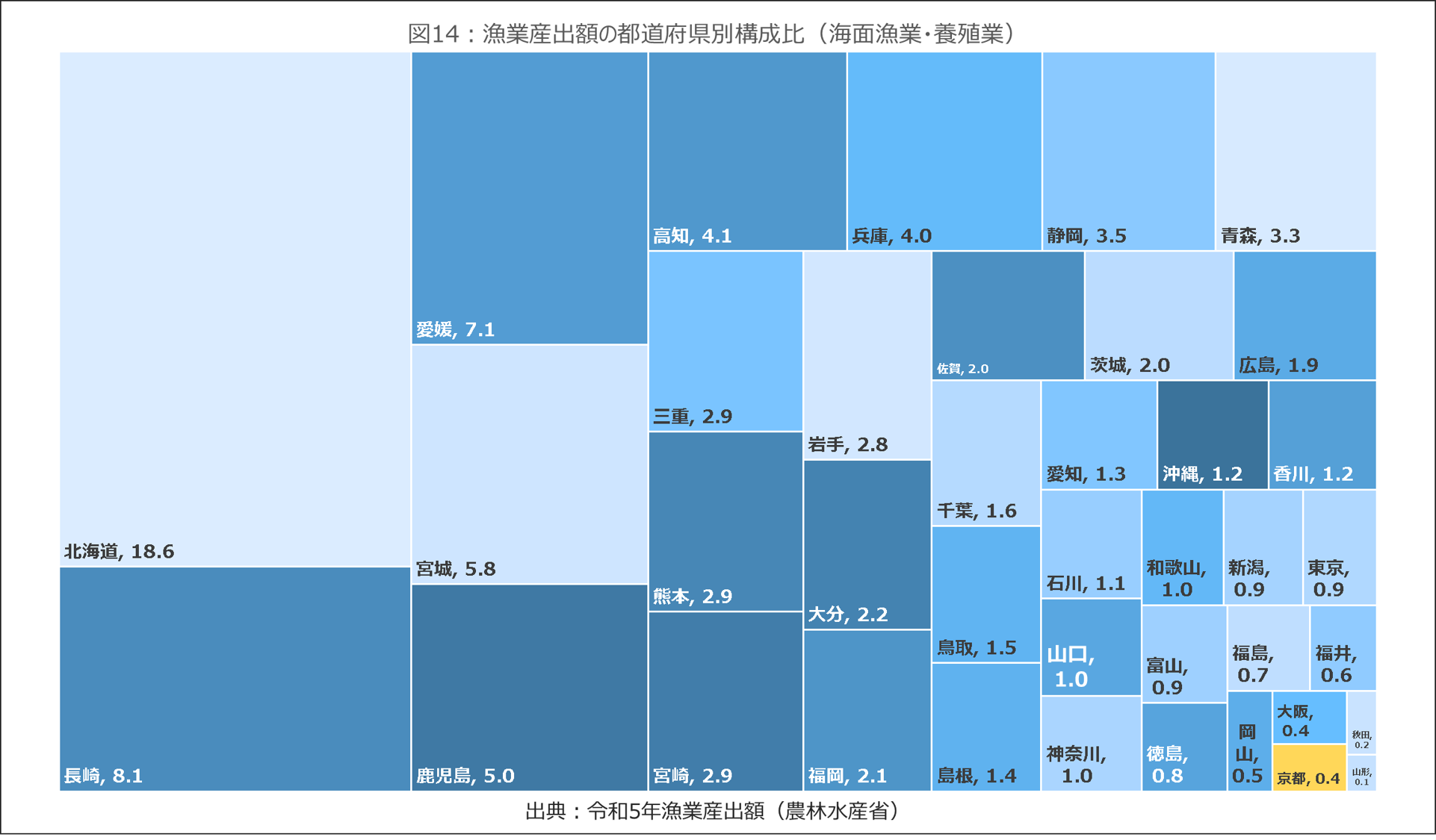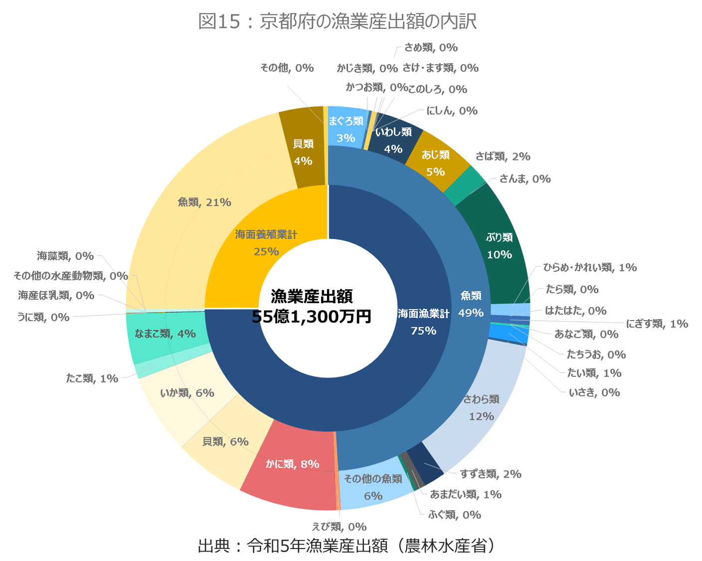 2023年の漁業産出額を見ると、全国の産出額のうち、京都府の産出額は0.4%を占め、全国で37番目となっています。(図14)