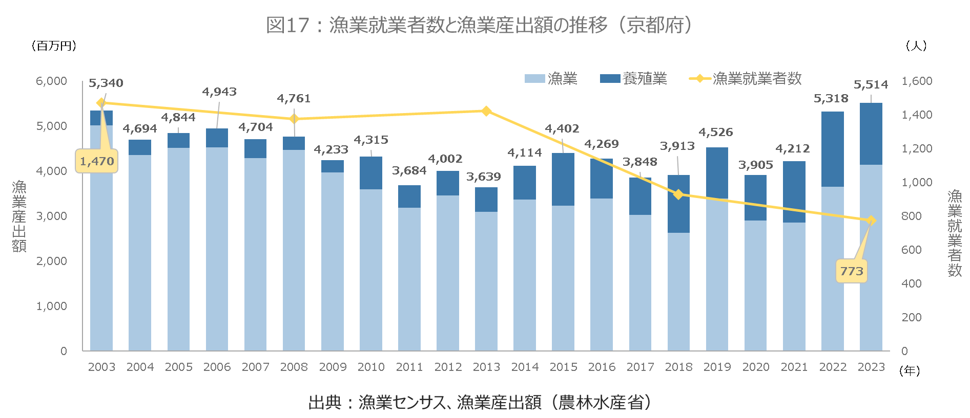 図17:漁業就業者数と漁業産出額の推移(京都府)