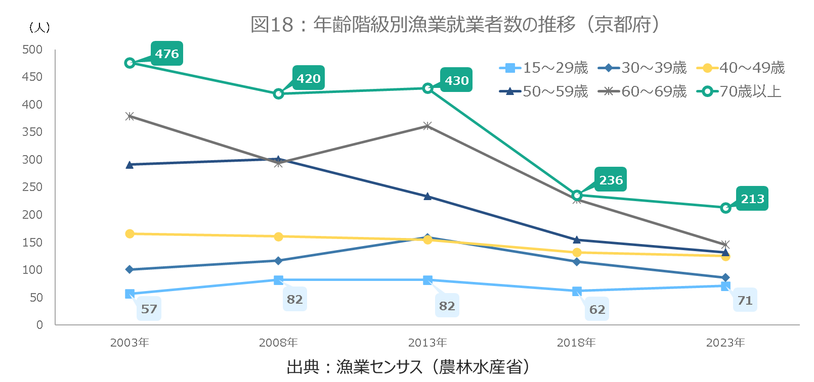 図18:年齢階級別漁業就業者数の推移(京都府)​​​​​​