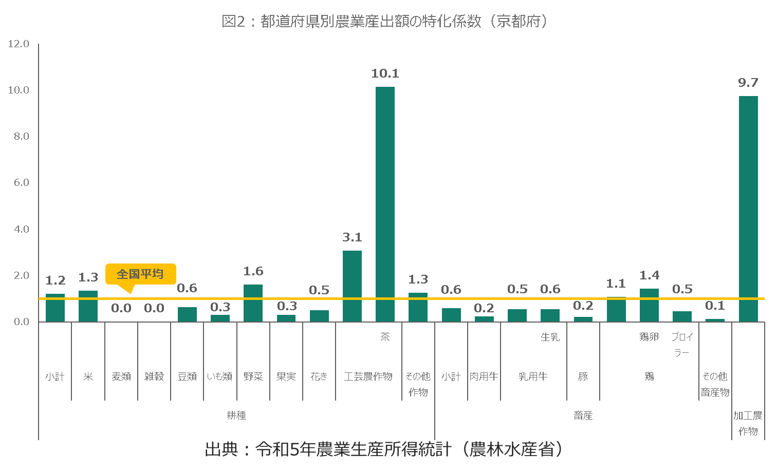 また、産出額の内訳から全国平均を1として算出された特化係数を見ると、「茶(生葉)」及び「加工農産物」の特化係数はそれぞれ10.1、9.7と全国平均と比べて約10倍になっています。(図2)​​​​​​