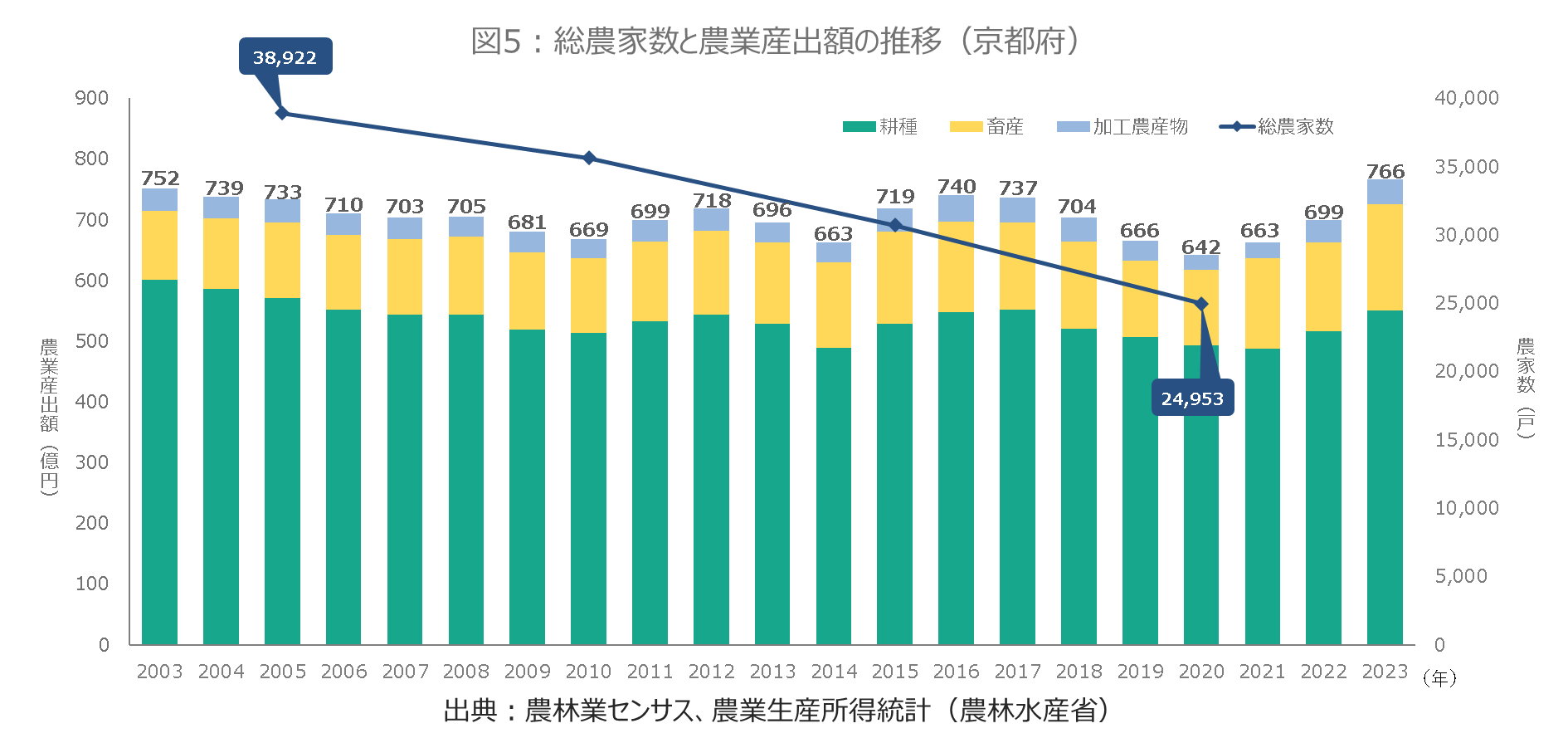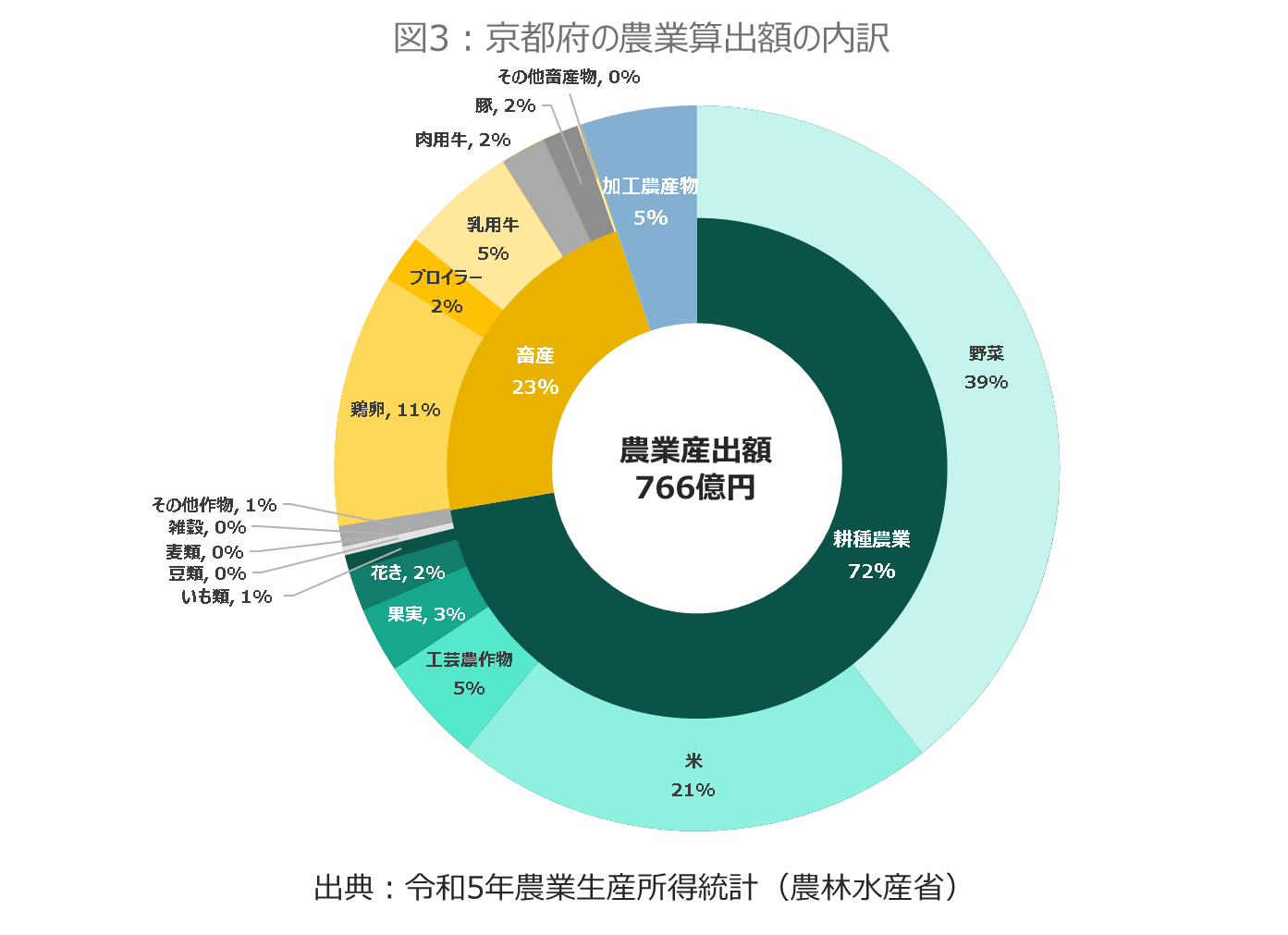 2023年の京都府の農業産出額は766億円で、その内訳は耕種農業が約72%、畜産農業が約23%、加工農産物が約5%となっています。