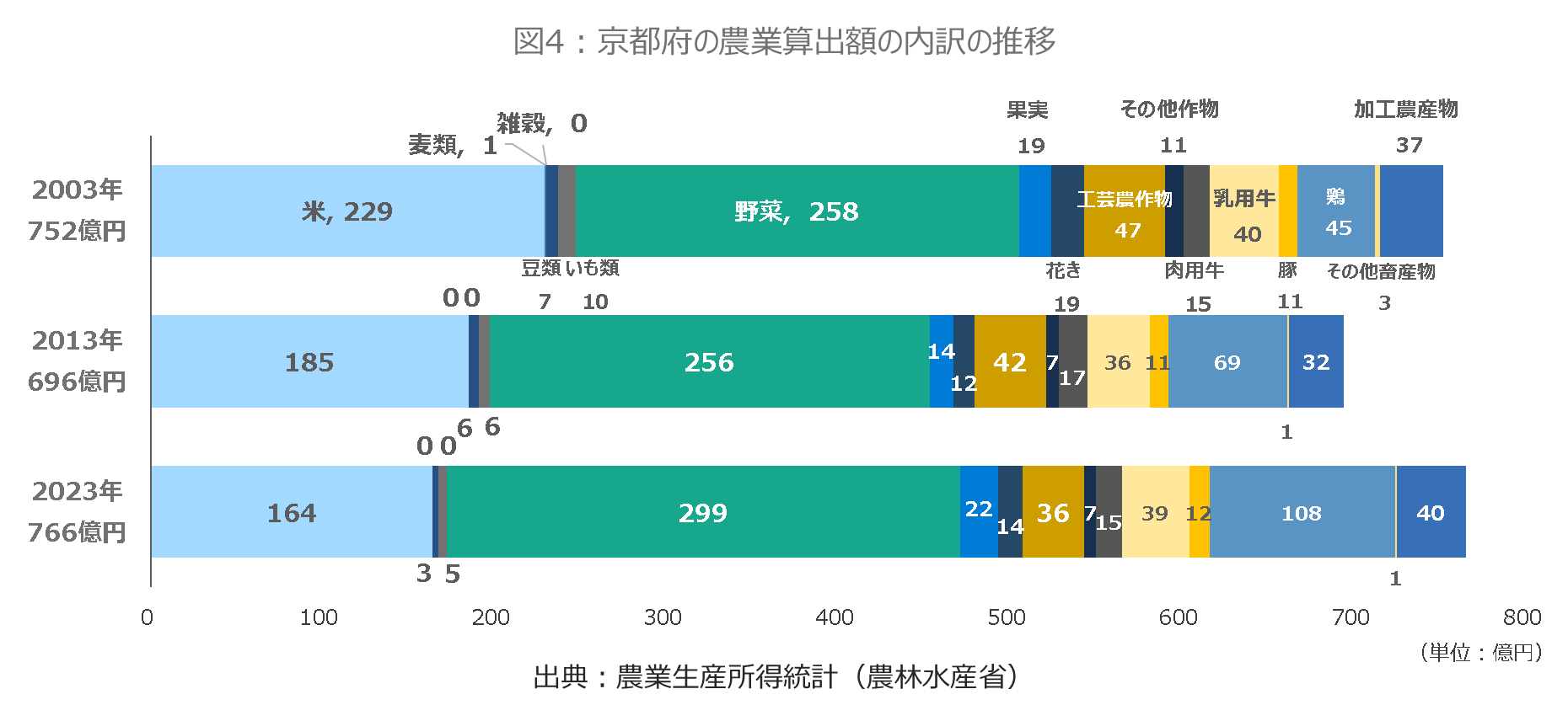グラフからは、この20年間で米の産出額が減少し、野菜及び鶏の産出額が増加していることが分かり、生産される品目に変化があることが見てとれます。(図4)