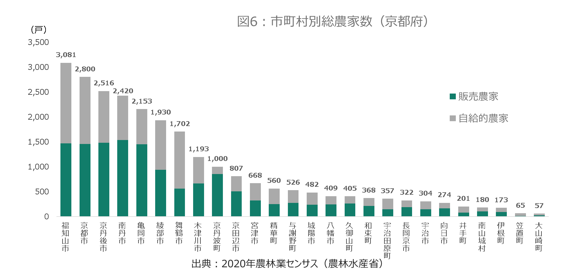 市町村別の農家数は、福知山市(3,081戸)、京都市(2,800戸)、京丹後市(2,516戸)の順に多くなっています。