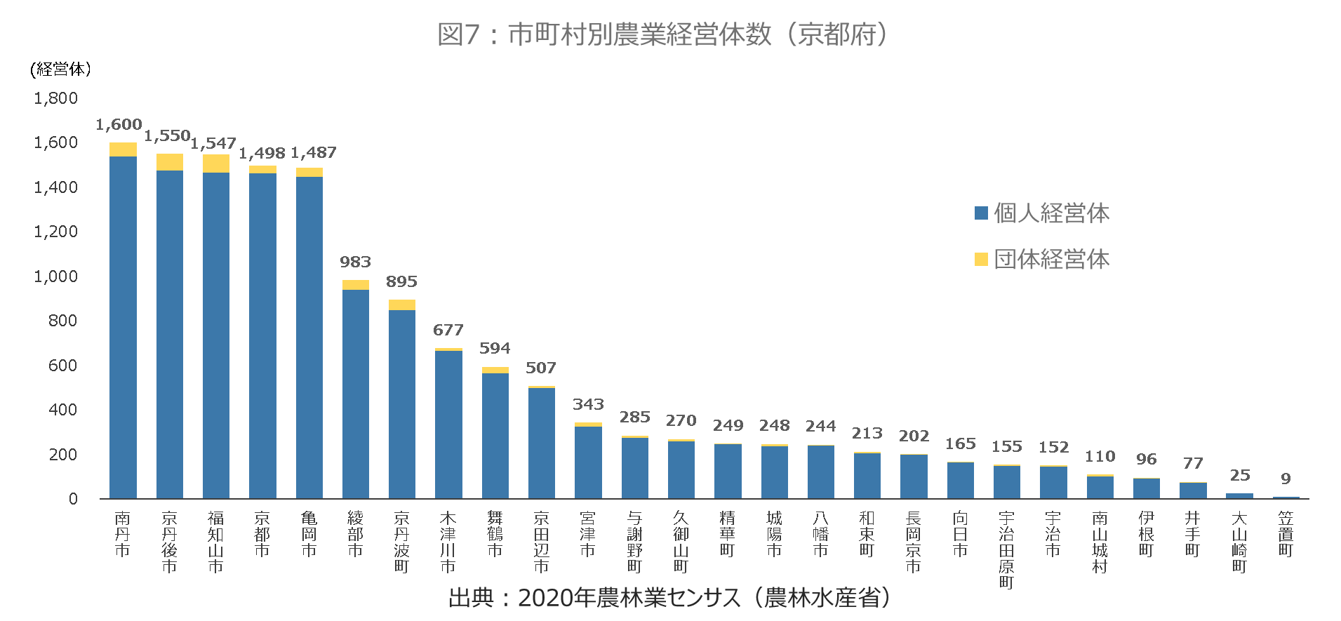 市町村別の農業経営体数を見ると、南丹市(1,600経営体)、京丹後市(1,550経営体)、福知山市(1,547経営体)の順に多くなっており、総農家数とはやや異なることが分かります。(図7)