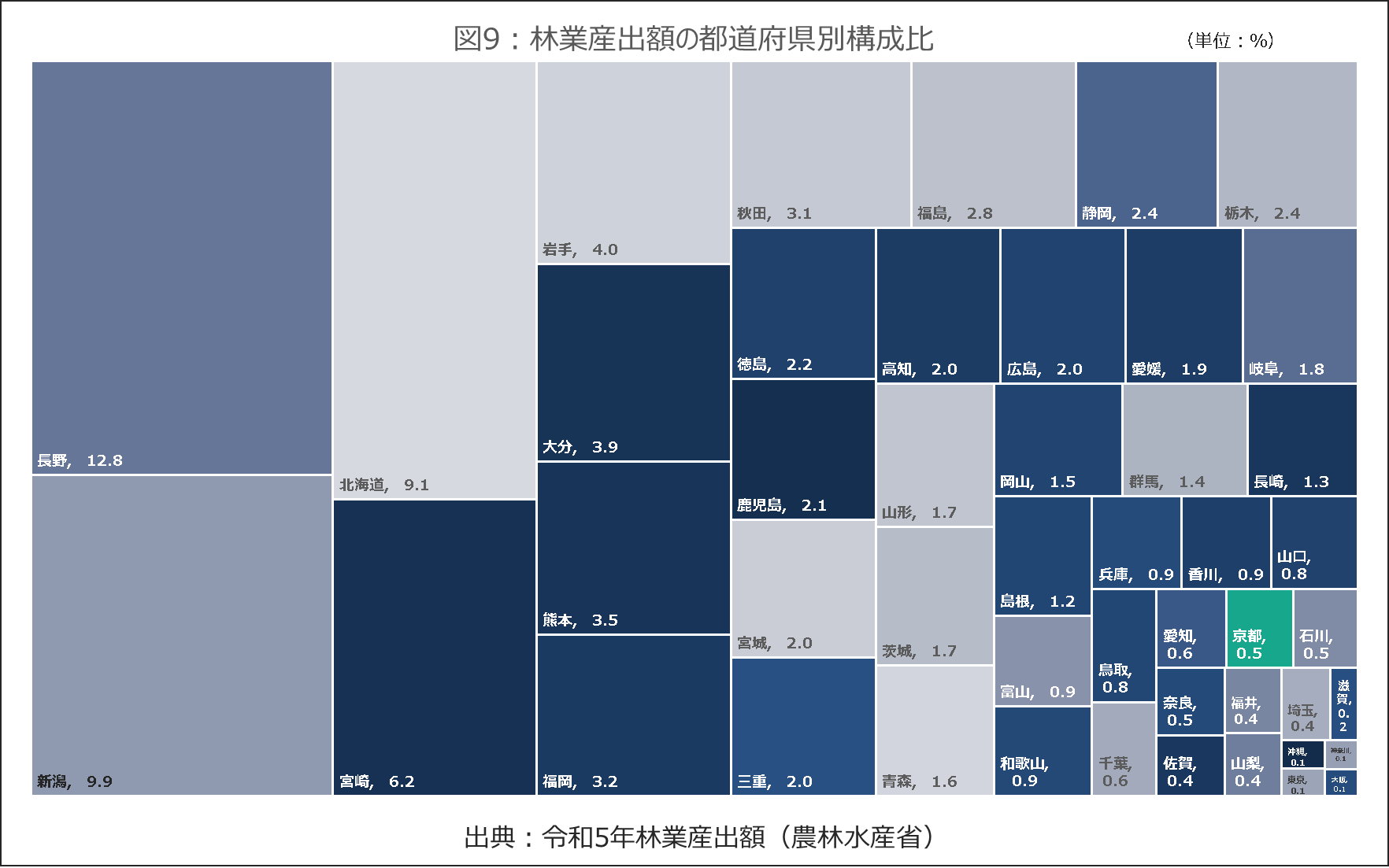 2023年の林業産出額を見ると、全国の産出額のうち、京都府の産出額は0.5%を占め、全国で36番目となっています。(図9)